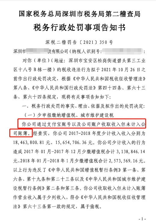 深圳某科技公司,通過支付寶賬號以及公司賬號收取收入,導致少計收入3411.85萬元,造成少繳增值稅571.24萬元以及城市維護建設稅。此外,稅務局通過核定征收的方式,查明該公司少繳企業(yè)所得稅37.43萬元。最終,上述公司被處百分之五十的罰款,共計3243277.46元。